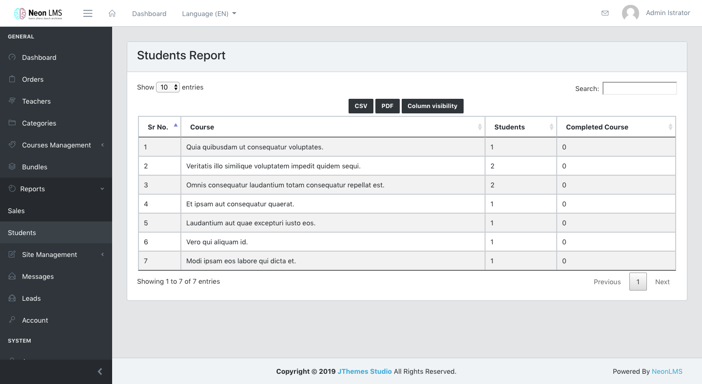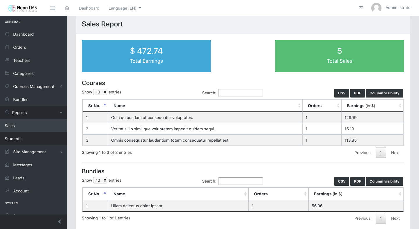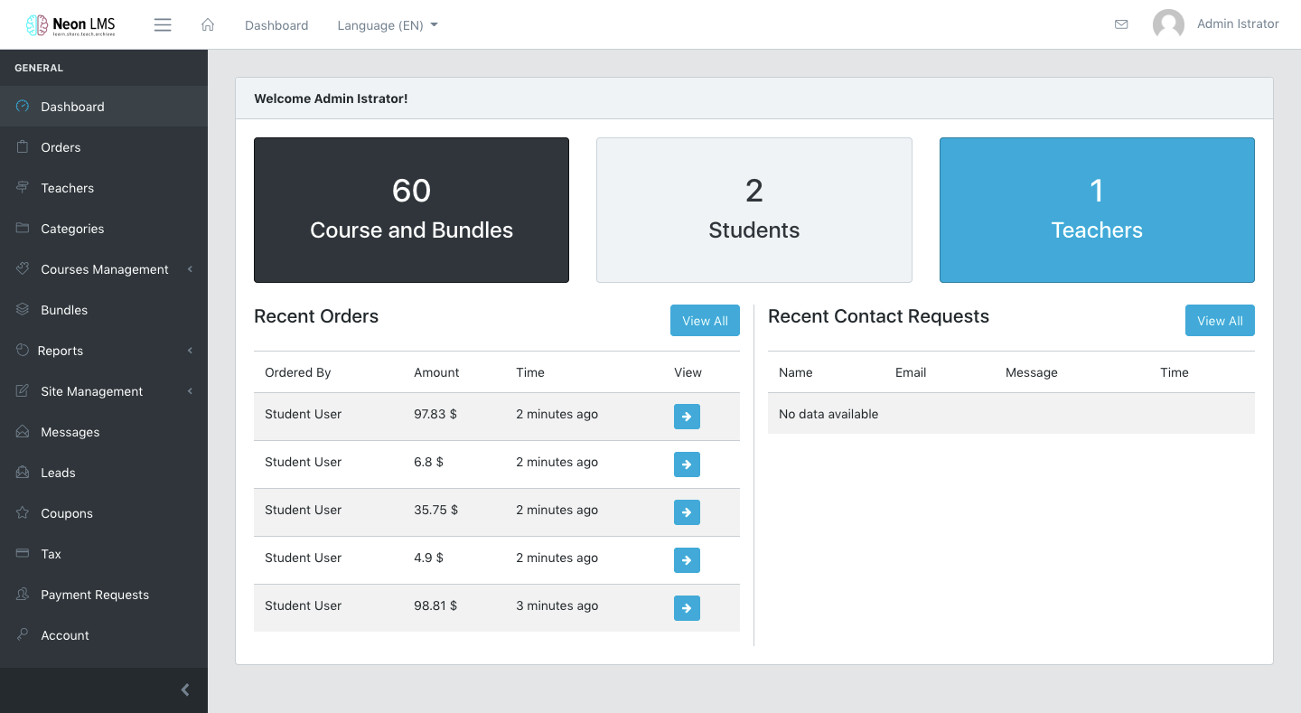 Neon LMS is a complete package script for setting up online courses and earn by enrolling students. The bundle includes responsive frontend website managed by full-fledge dashboard for Admin, Teachers and Students. Admin can manage every aspect of the system while Teacher can create multiple courses with Lessons and Tests. User can browse through this list and can enroll as student by paying for the course and educate themselves anytime and from anywhere.