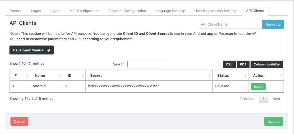Generate and Revoke API Client ID and Client Secret. You can use them to create android apps or Testing API.