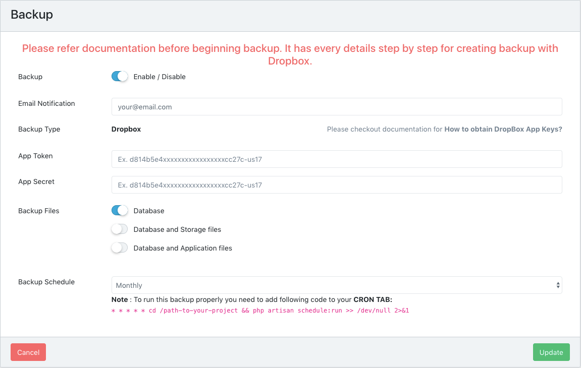 You will be notified every time on your email when your backup is generated and saved. You need to add your email id here to receive backup notification. You can also Enable / Disable backup as if you want to backup your application or not.
