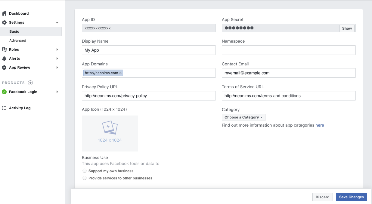 Settings -> Basic. Your screen will look like this. Fill following details and click on Save Changes- Display Name : Enter you App name