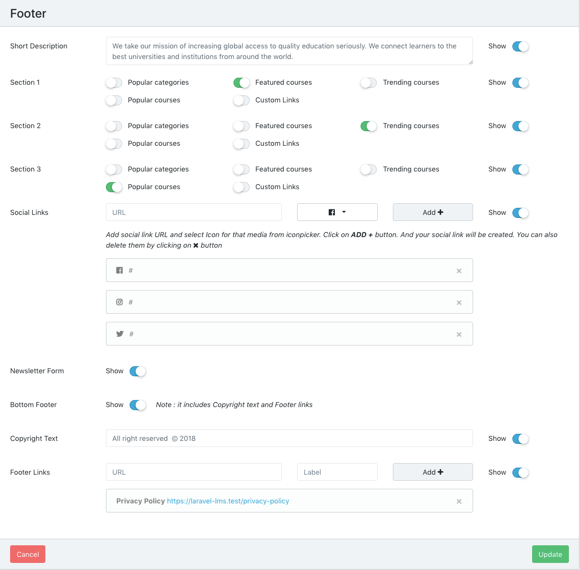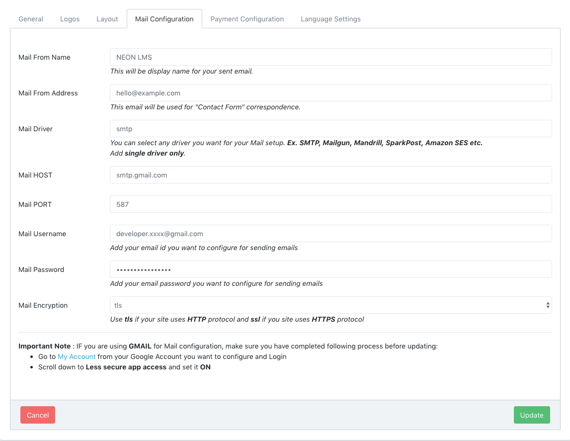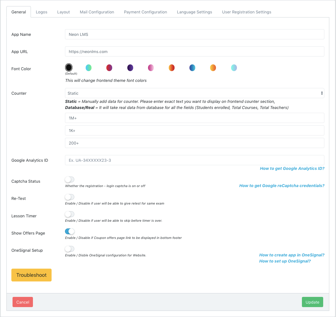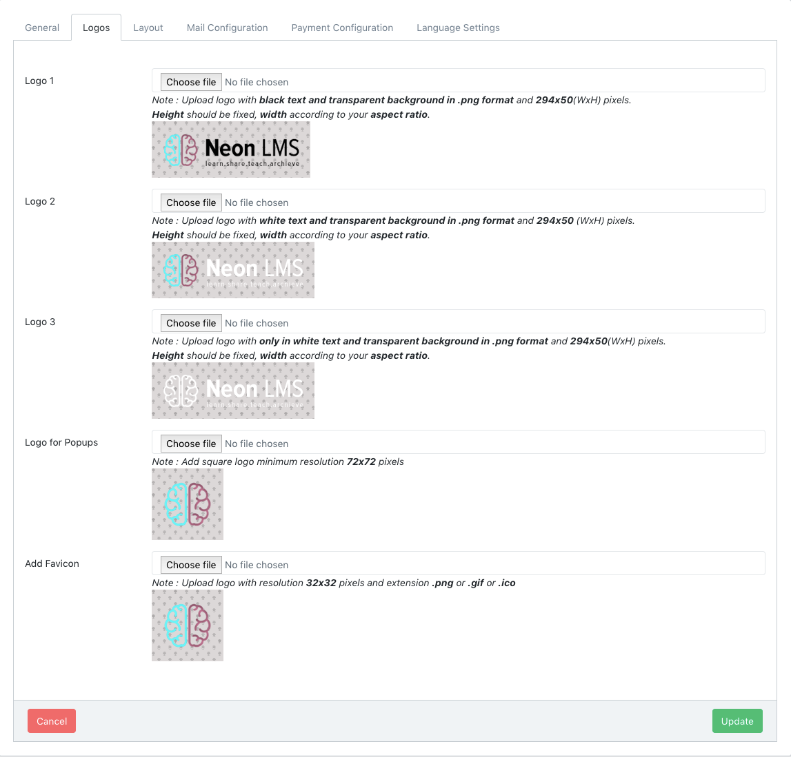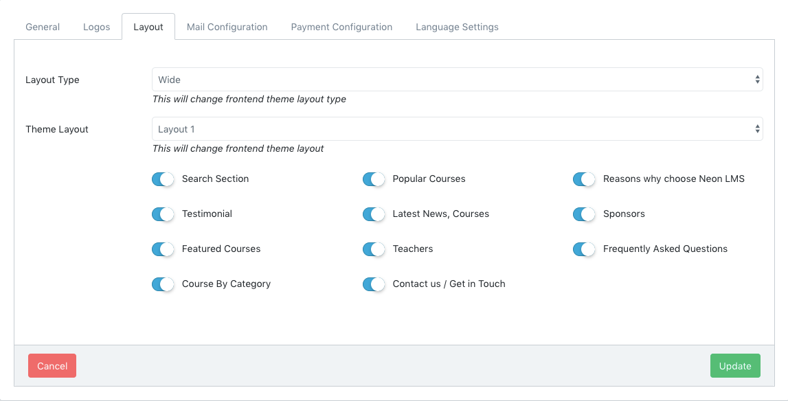 We are supporting multiple languages for users. Here you can select defaul language for the website and layout for the same. There are two options available for layout: Left to Right and Right to Left. First one is regular layout which we see in normal website, But the Right to Left layout is used with particular languages like Arabic, Urdu etc. There are currently four languages available in Neon LMS : English, Spanish, French and Arabic.