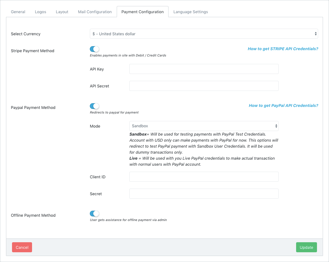 We are presenting you dynamic payment methods for your website. And you can also select currencies from the list in which you will be able to deal the purchases. You can enable/disable payment methods you want to show while user checkout after adding item to the cart. The only payment methods enabled in dashboard will be displayed while user checks out.