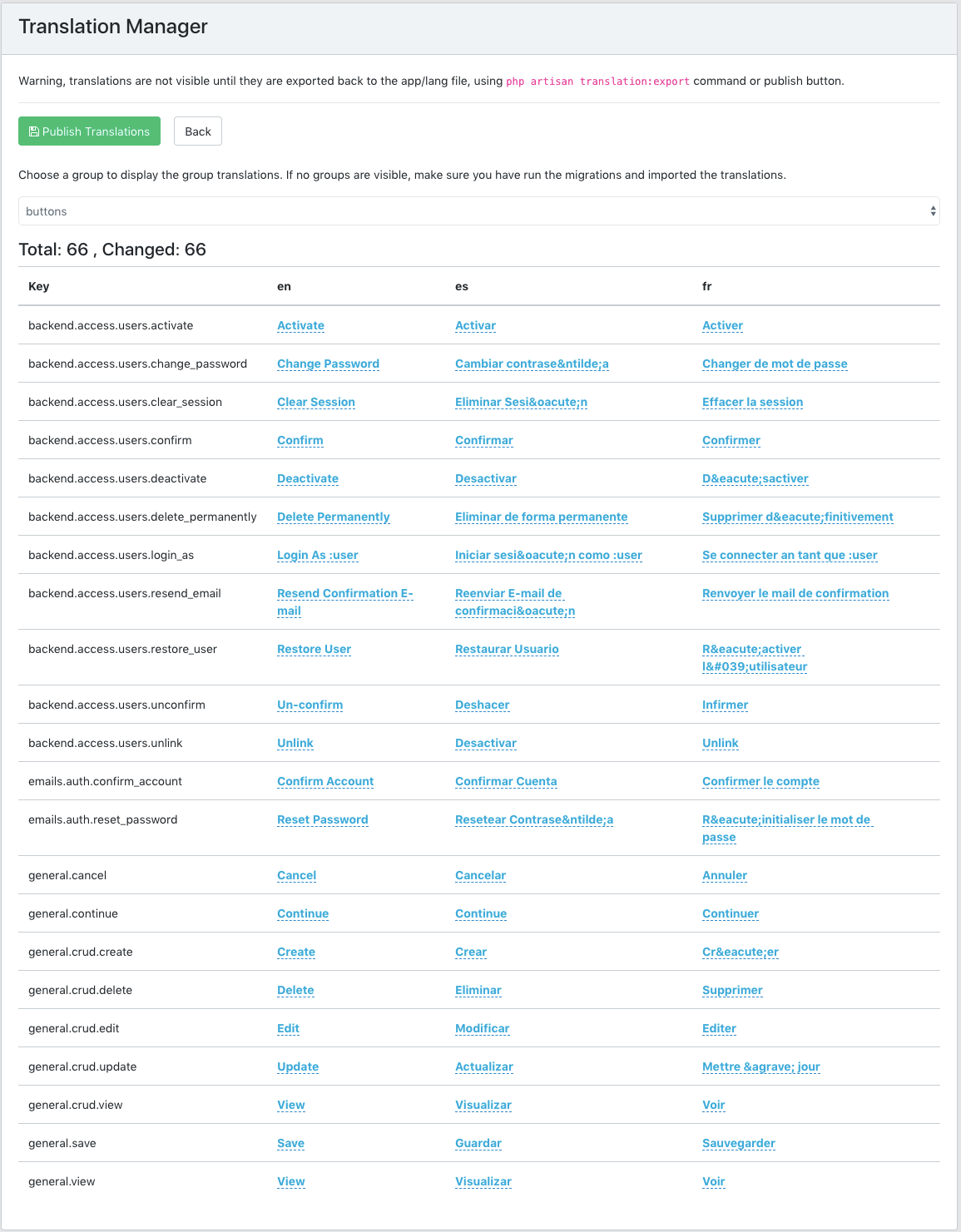It helps you in managing locales of the website. Here you can see list off all the languages file. You can edit, update and delete them. You can also create new locale. Means you can add new language. We are giving by default three locales with theme; English, Spanish and French. You can also update those files if you think this is not a right translation.