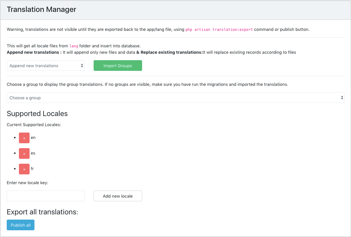 If you click on Choose groups and it does not show any option. Then click on Import Groups button. By that all the locale files will be added to the website and you will see list of files in choose group. If you select a group from the list, you will be redirected to view/edit page
