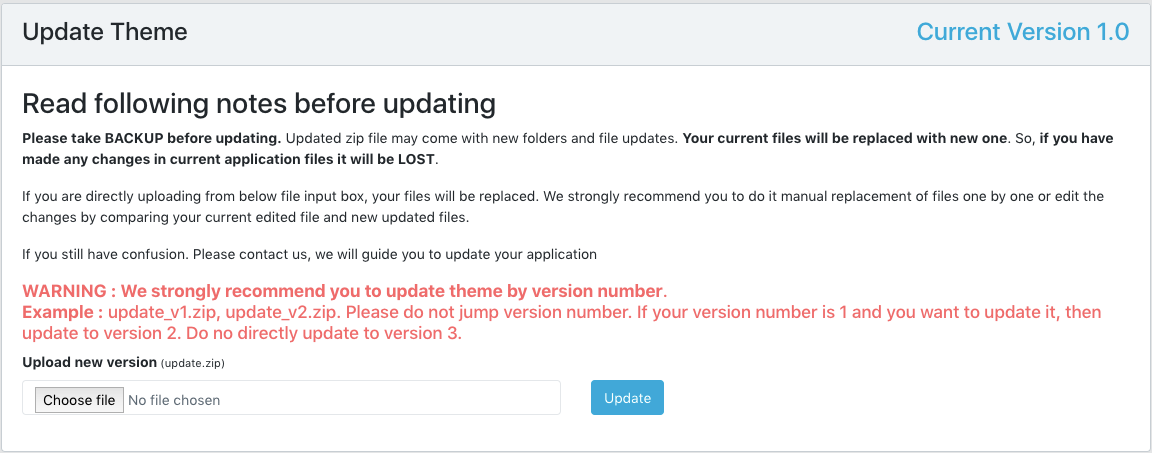 We strongly recommend you to update theme by version number. Example : update_v1.zip, update_v2.zip. Please do not jump version number. If your version number is 1 and you want to update it, then update to version 2. Do not directly update to version 3.