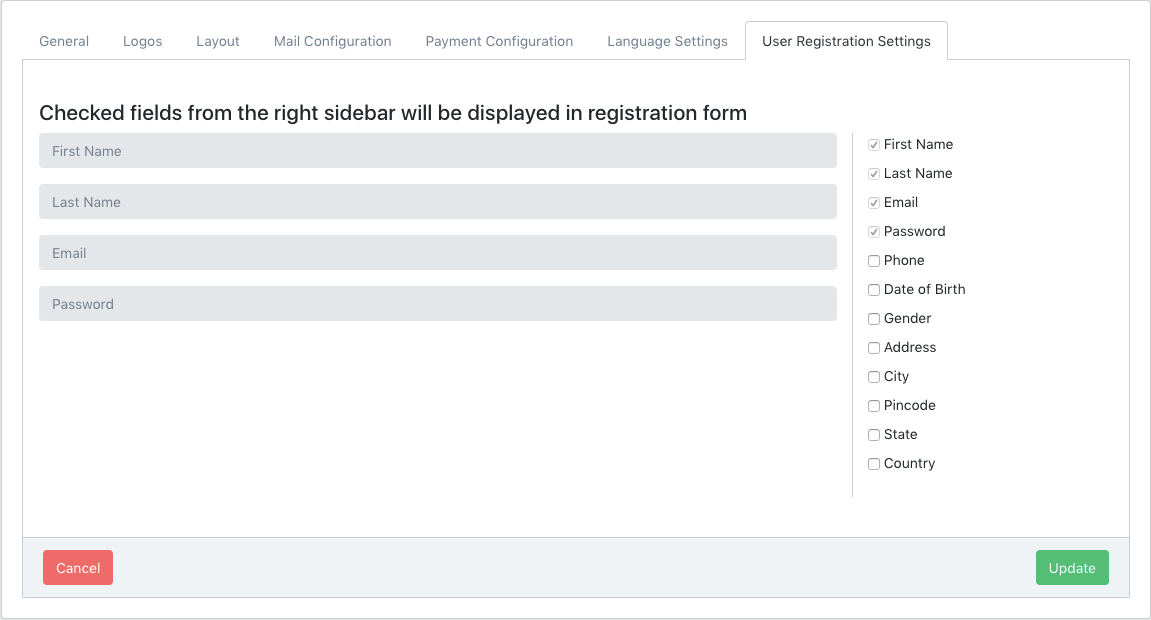 Here you can specify fields to display which will be added in registration form when user signs up. You can ask for specific details from the user from listed in right panel.